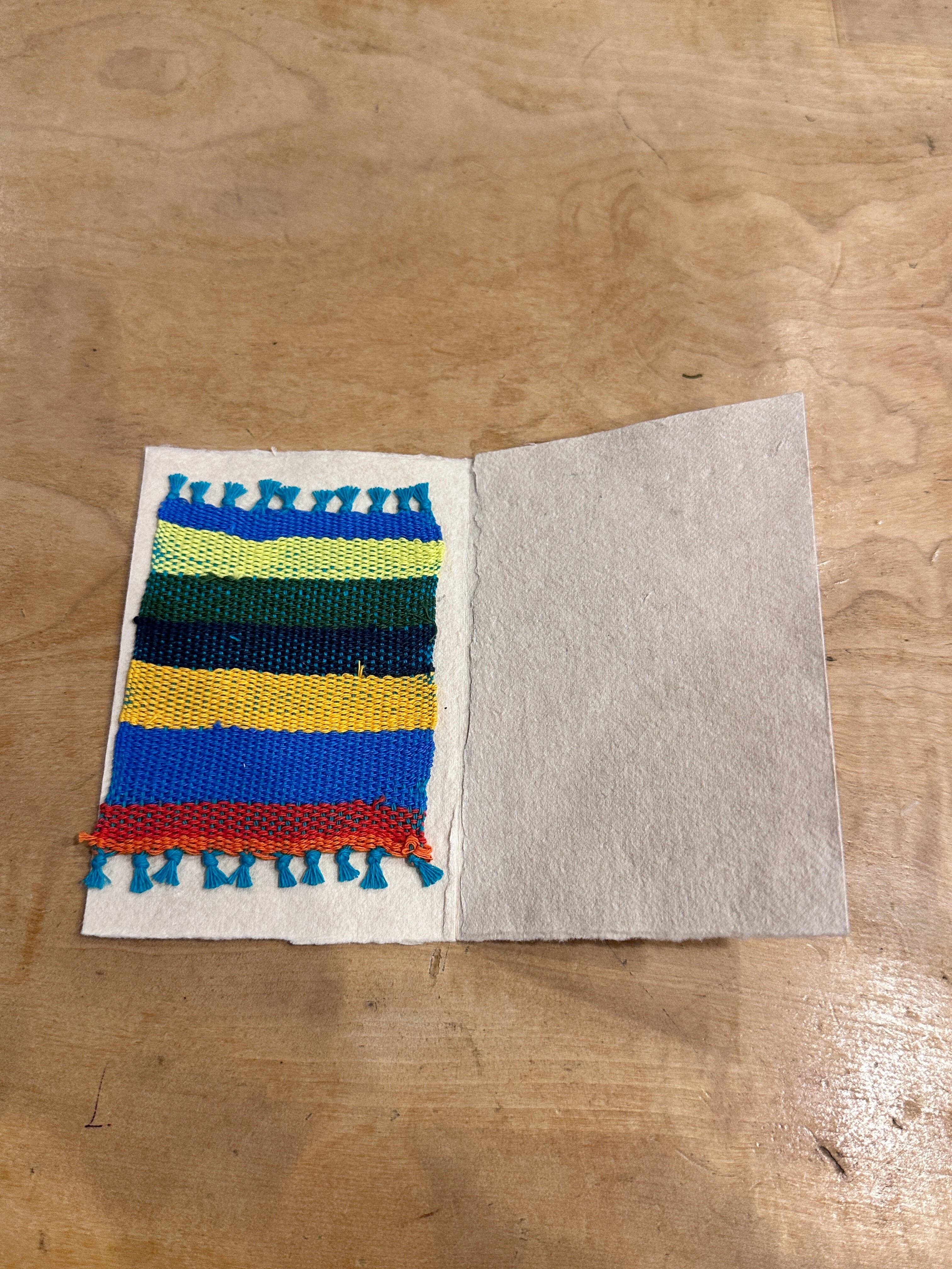 手漉き和紙で見開きのカードを作り、中には手織りコースターが1枚入っています。閉じた状態では、窓から色とりどりのコースターが見えます。